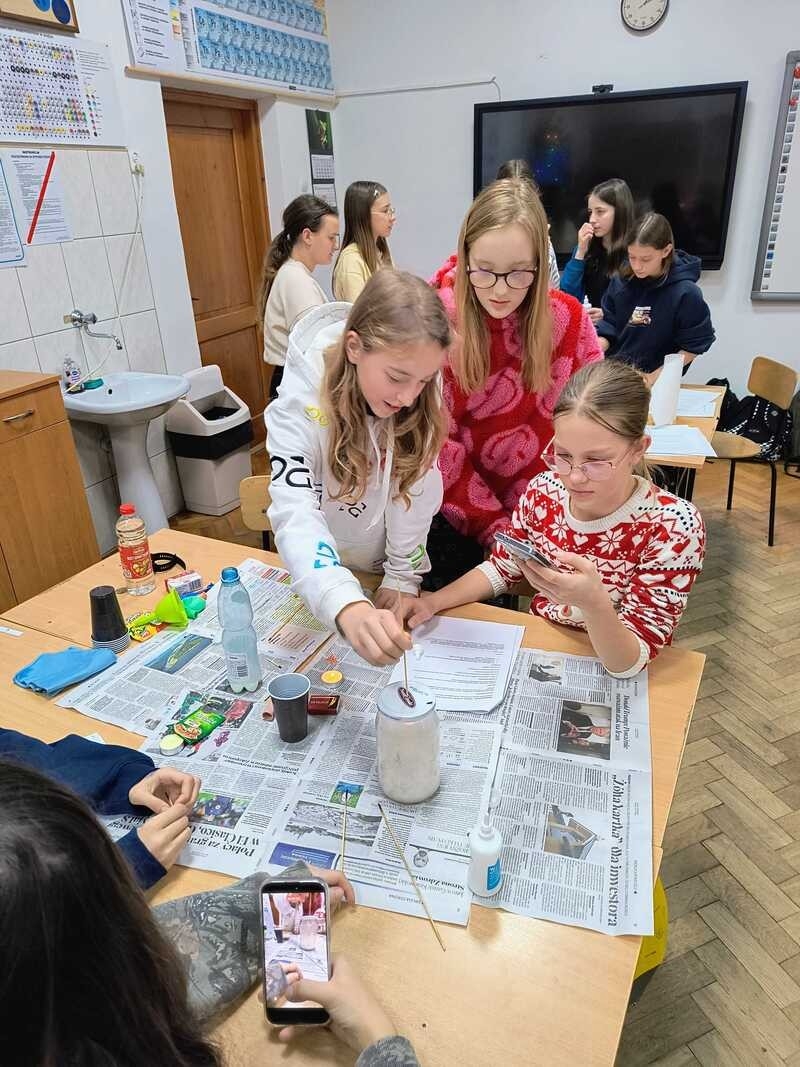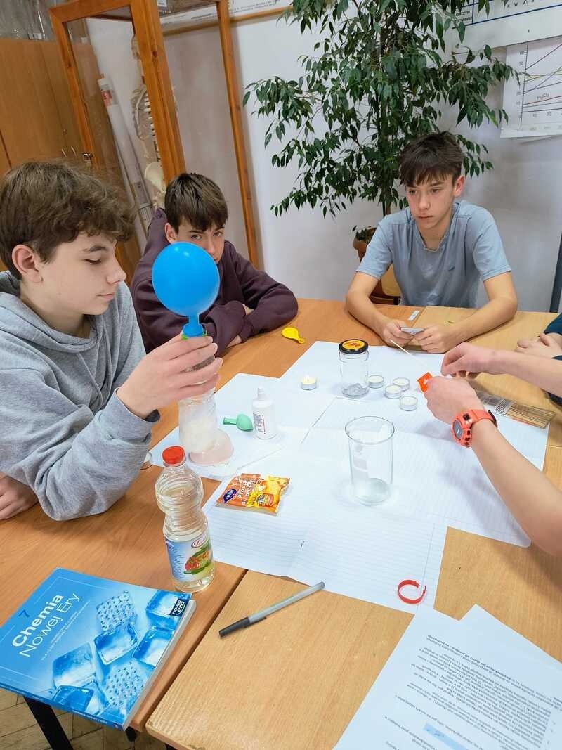 Uczniowie klasy 7a i 7b dopiero od września tego roku szkolnego rozpoczęli proces poznawania tej tajemniczej nauki jaką jest chemia. Na podsumowanie działu o składnikach powietrza przeprowadzona została praktyczna lekcjach podczas której uczniowie mogli samodzielnie przeprowadzić doświadczenia dotyczące tlenku węgla(IV) czyli popularnego dwutlenku węgla oraz tlenu.