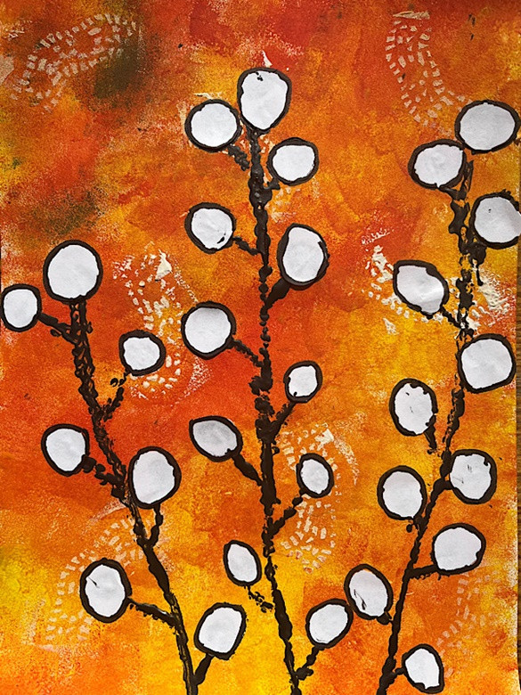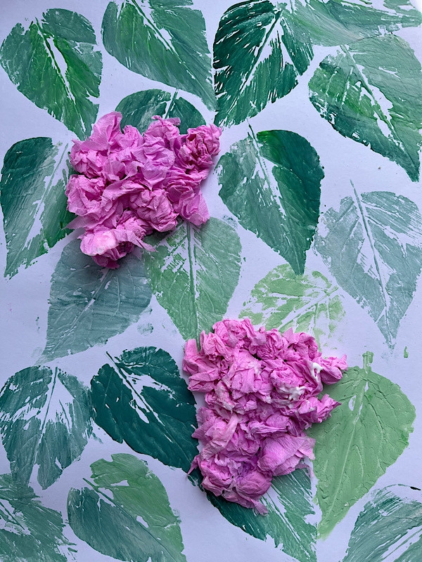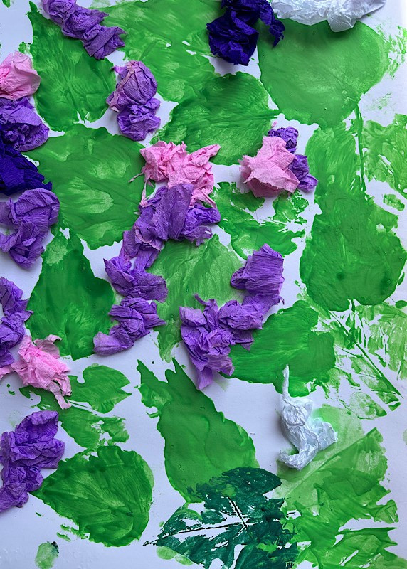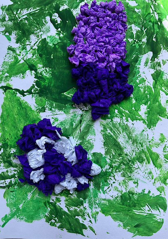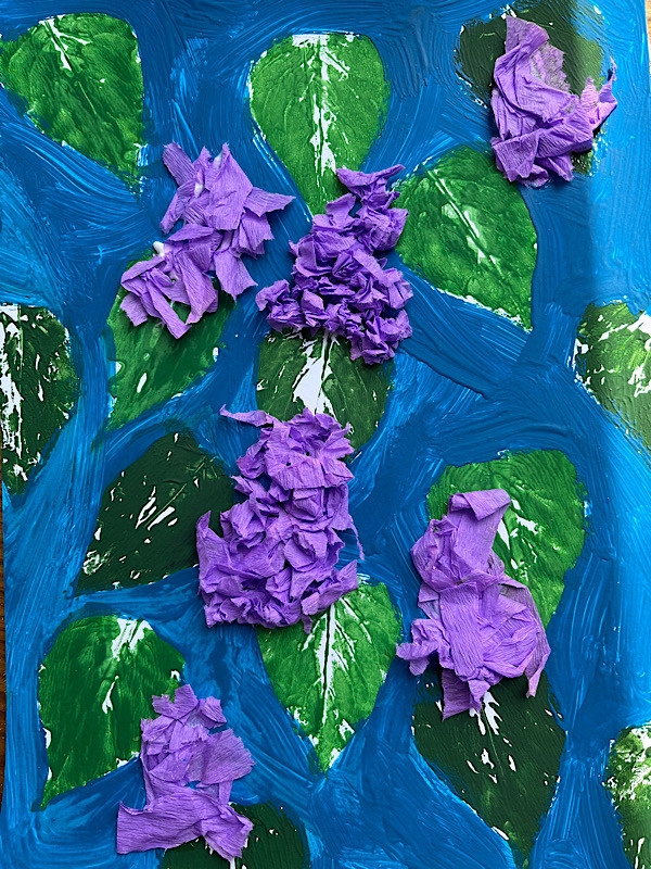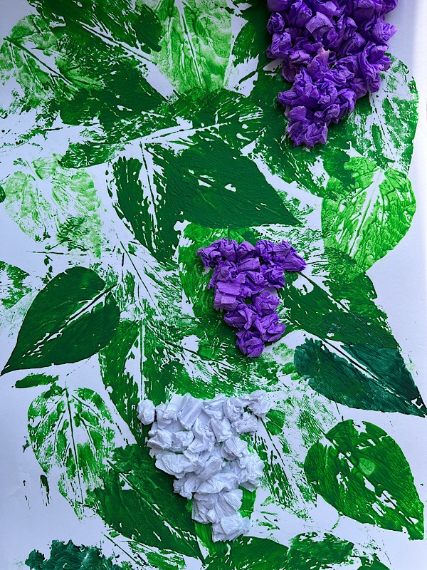 Bzy - technika mieszana, tło - stemplowanie liściem bzu