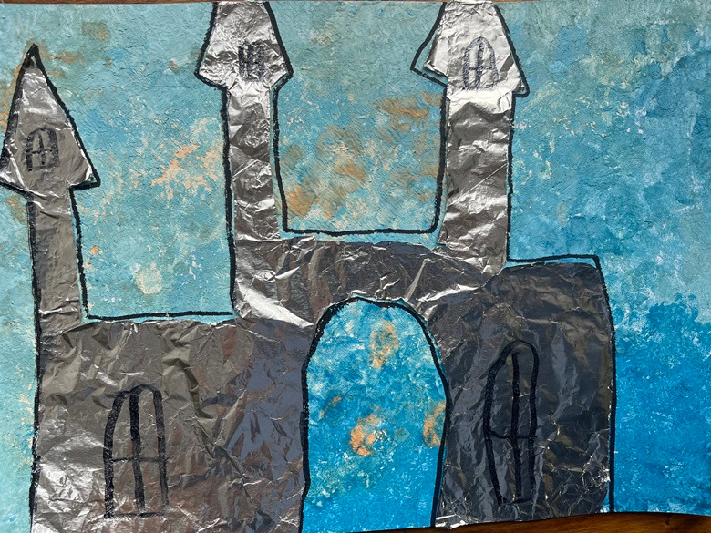 Zamek - wyklejanka z folii aluminiowej, tło - malowanie plamą: