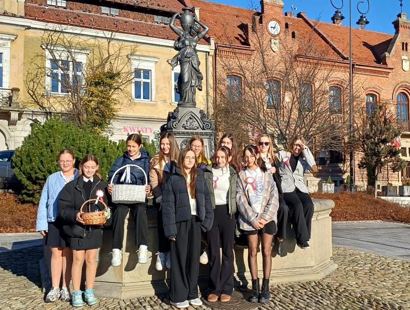 Tego dnia aktywni byli również nasi wolontariusze. Wyruszyli na myślenicki rynek, by w niezwykły sposób uczcić zbliżające się Święto 11 listopada. Uczniowie rozdawali napotkanym mieszkańcom ręcznie wykonane kotyliony, zachęcając jednocześnie do wspólnego świętowania oraz okazywania patriotyzmu. Ten prosty gest sprawił, że zwykłe przejście przez rynek zamieniało się w małe spotkanie z pamięcią i życzliwością.