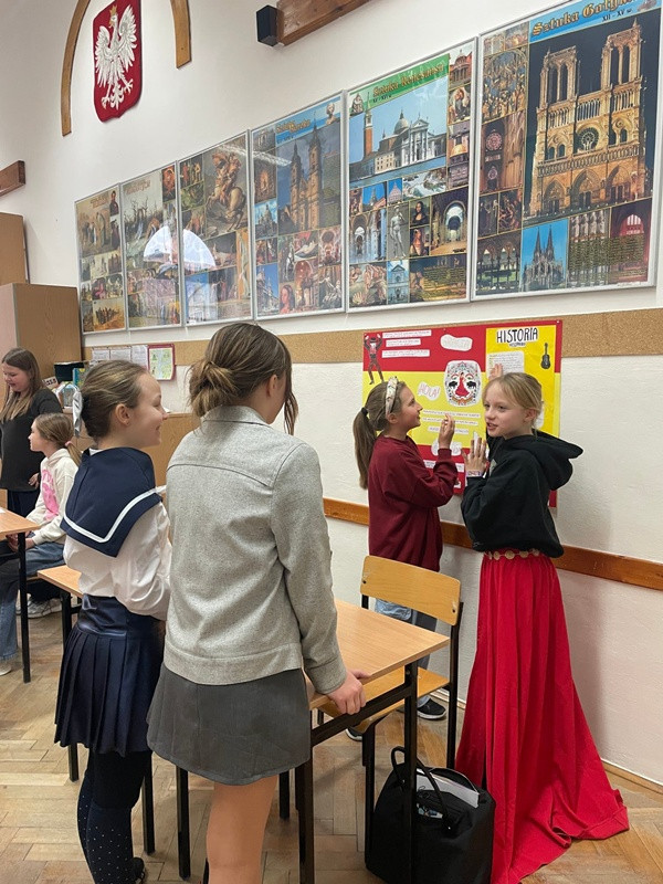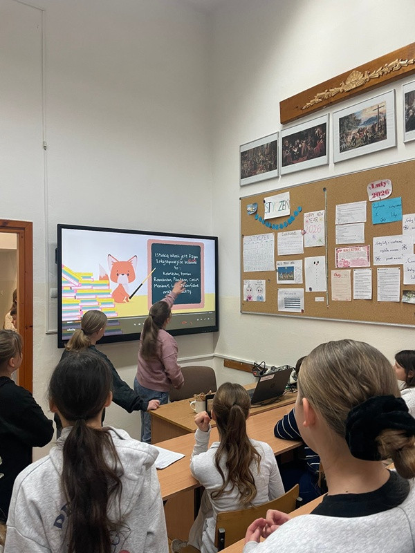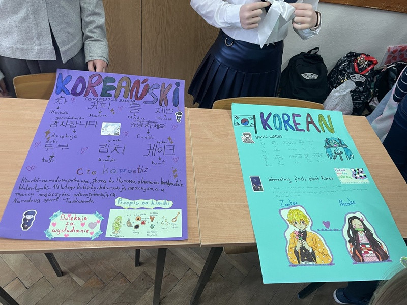 Podczas przerw międzylekcyjnych sala nr 16 zamieniła się w prawdziwą językową mapę świata. Uczniowie zaprezentowali m.in. język hiszpański, francuski, włoski, japoński oraz koreański, ucząc rówieśników podstawowych zwrotów, przygotowując quizy, słowniczki i krótkie prezentacje kulturowe.