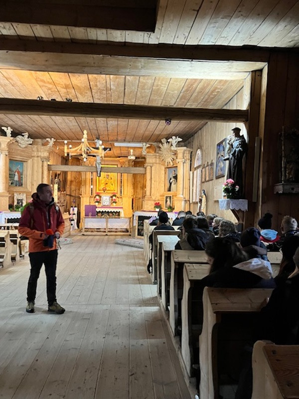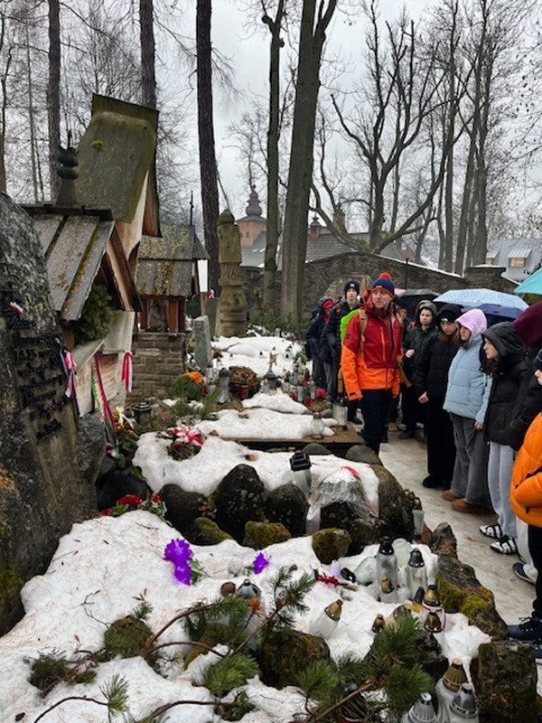 Następnie udaliśmy się na Pęksowy Brzyzek, czyli najstarszą nekropolię w Zakopanem. Na tym cmentarzu pochowane są wybitne postacie polskiej kultury, taternictwa i sztuki: min. Kazimierz Przerwa- Tetmajer, Kornel Makuszyński, Władysław Orkan, Tytus Chałubiński, Stanisław Marusarz i Helena Marusarzówna, Bronisław Czech, Jan Krzeptowski - Sabała, Władysław Hasior, Stanisław Witkiewicz. Odwiedziliśmy również kościółek na Pęksowym Brzyzku, który jest jednym z najstarszych zabytków miasta i ważnym miejscem dla lokalnej społeczności. Jego założycielem był ks. Józef Stolarczyk wywodzący się z pobliskiego Jordanowa.
