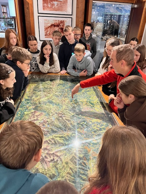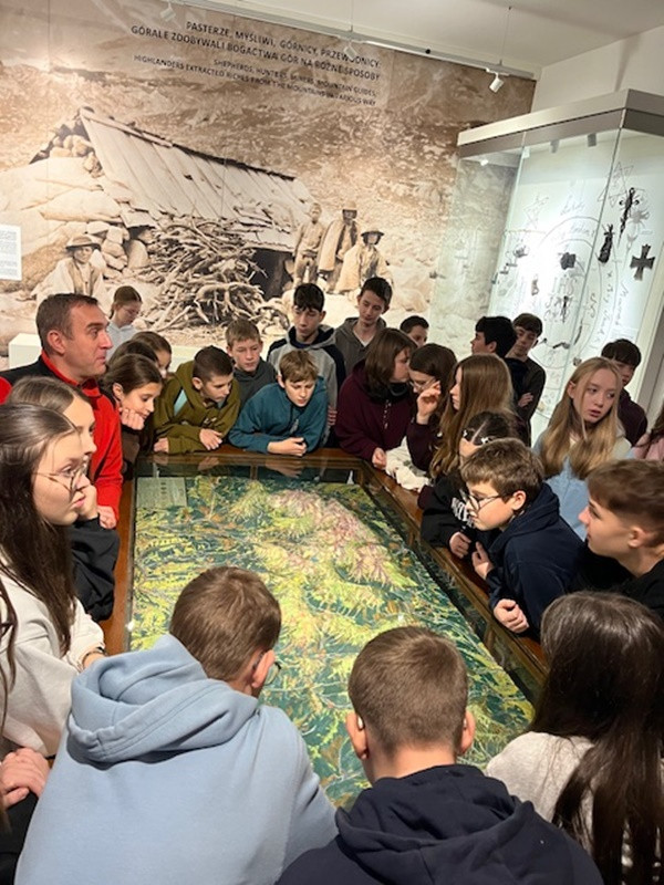 Pierwszym punktem programu było zwiedzanie Muzeum Tatrzańskiego im. dr Tytusa Chałubińskiego gdzie spotkaliśmy się z panem przewodnikiem Janem Krzeptowskim - Sabałą, którego pra, pra, pradziadek był wiernym przyjacielem dr Chałubińskiego. Uczniowie zapoznali się z przyrodą Tatr, dowiedzieli się, że Zakopane słynie z unikalnego stylu architektonicznego, który zapoczątkował Stanisław Witkiewicz - styl ten łączy elementy tradycyjnej architektury góralskiej z motywami inspirowanymi przyrodą Tatr. Pan Krzeptowski barwnie opowiadał o tradycjach góralskich oraz o historii regionu.