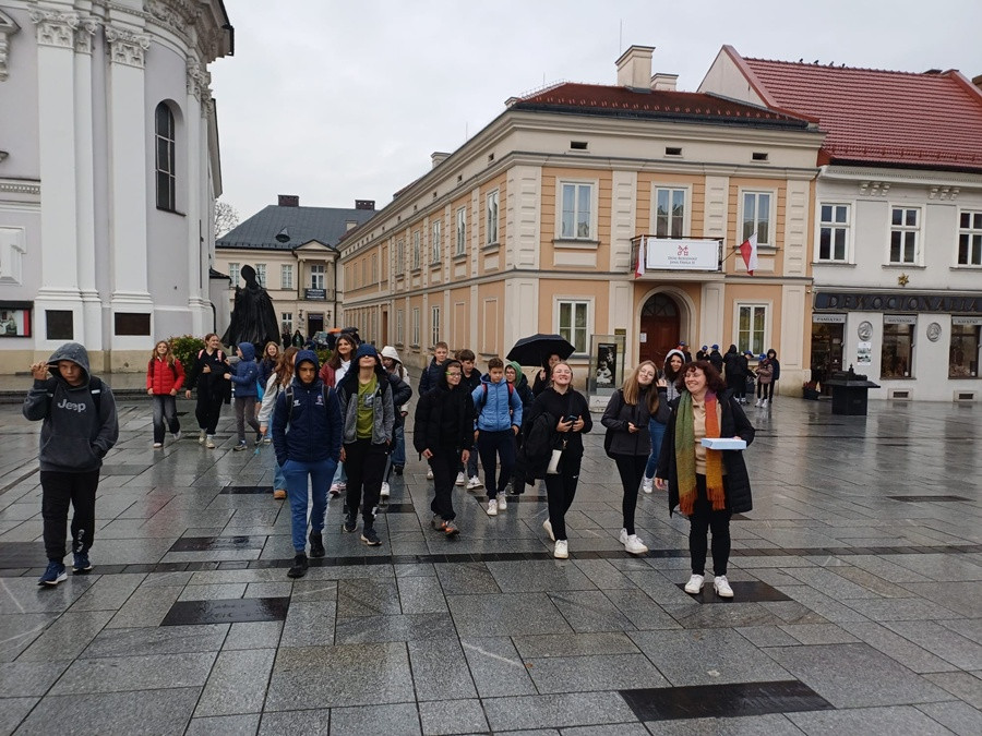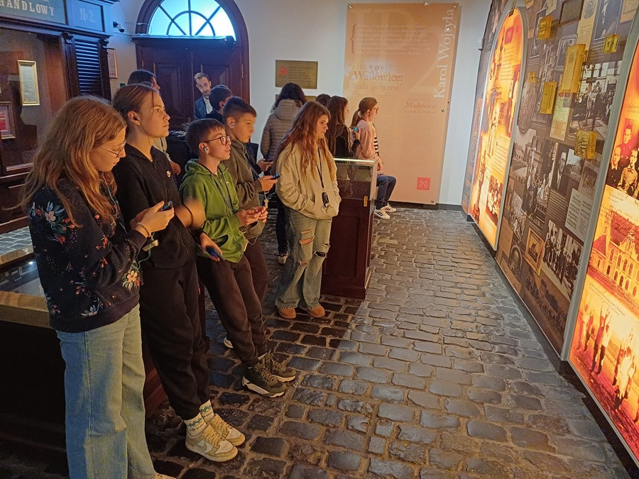Drugim przystankiem w dzisiejszym planie pobytu były Wadowice. Odwiedziliśmy nowoczesne, multimedialne muzeum - Dom Ojca Świętego Jana Pawła II. Miłą niespodzianką dla uczniów i nauczycieli była możliwość wysłuchania prelekcji muzealnej w ich języku ojczystym. Po całodniowym zwiedzaniu wróciliśmy do Myślenic. W szkole czekał na nas przygotowany poczęstunek oraz gry i zabawy z animatorami.