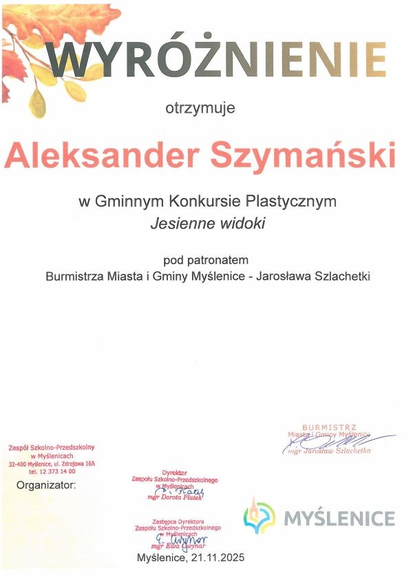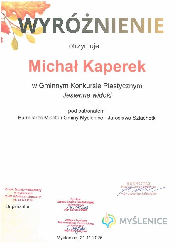 Naszym uczniom, Aleksandrowi i Michałowi, serdecznie gratulujemy tego osiągnięcia. To wyróżnienie stanowi dowód na to, że w naszej szkole nie brakuje młodych artystów, którzy mają pasję i chęć wyrażania siebie poprzez sztukę. Konkurs „Jesienne Widoki” pokazał, jak ważna jest rola takich wydarzeń w kształtowaniu wrażliwości artystycznej u dzieci i młodzieży, a także jak bardzo rozwija to ich wyobraźnię. Jesteśmy dumni z naszych uczniów i życzymy im dalszych sukcesów w przyszłych przedsięwzięciach artystycznych!