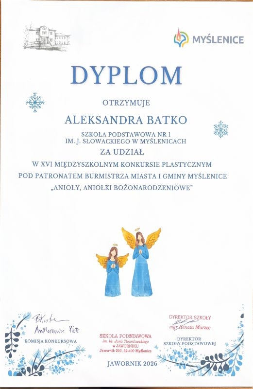 Z radością informujemy, że uczeń klasy 2b Aleksander Szymański zdobył wyróżnienie w XVI edycji Międzyszkolnego Konkursu Plastycznego „Anioły, Aniołki Bożonarodzeniowe”, organizowanego pod patronatem Burmistrza Miasta i Gminy Myślenice, w kategorii forma płaska.