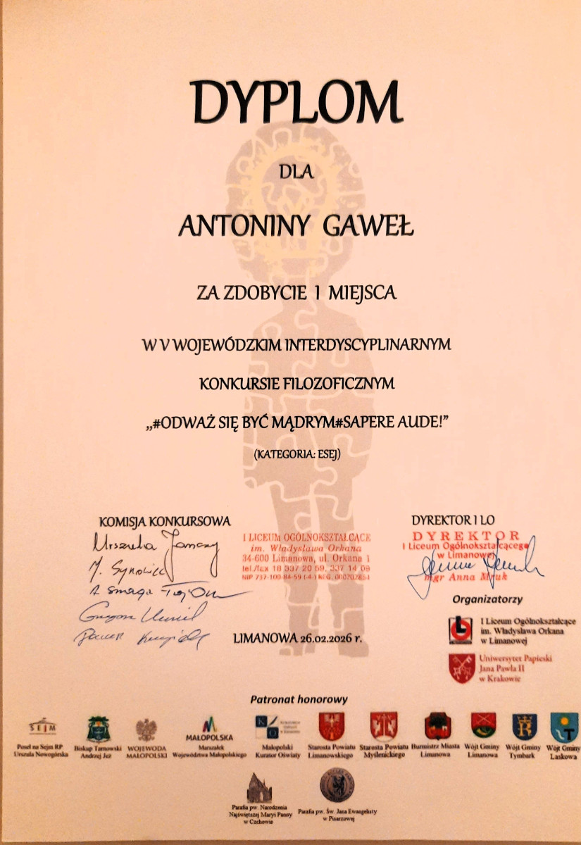 26 lutego 2026 roku w I Liceum Ogólnokształcącym im. Władysława Orkana w Limanowej odbyła się uroczysta gala V Wojewódzkiego Interdyscyplinarnego Konkursu Filozoficznego „Sapere Aude! Odważ się być mądrym”.