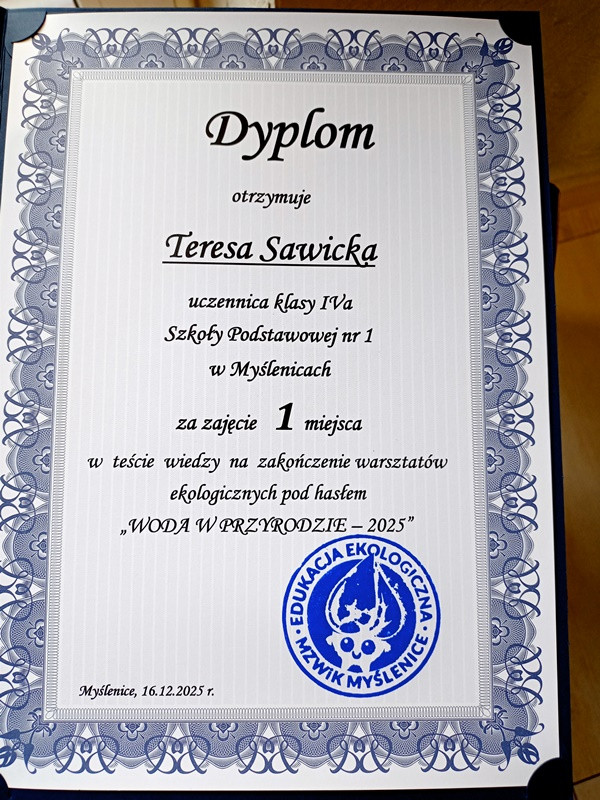 Miło nam poinformować, że Teresa Sawicka uczennica klasy 4a zajęła I miejsce w teście wiedzy, który odbył się 10 grudnia na zakończenie warsztatów ekologicznych „Woda w przyrodzie 2025”. Warsztaty zostały zorganizowane przez Miejski Zakład Wodociągów i Kanalizacji w Myślenicach.