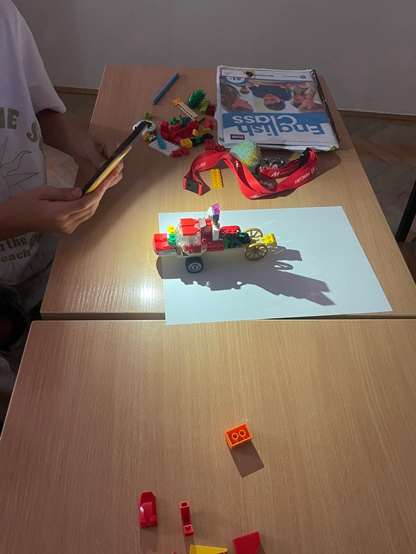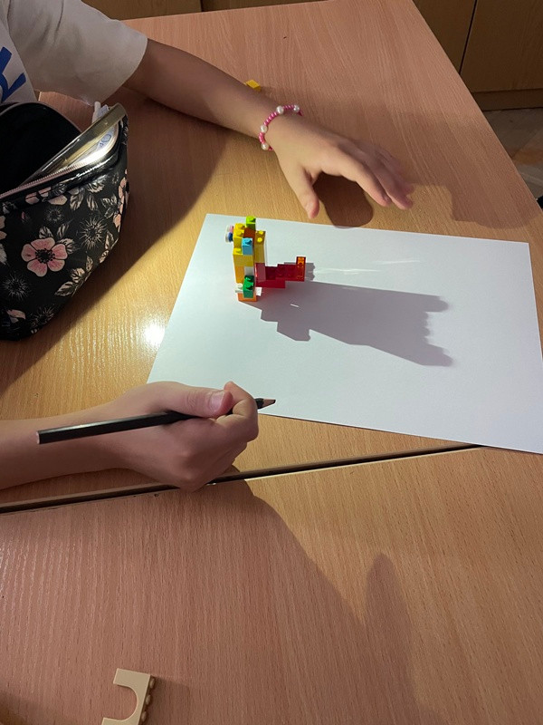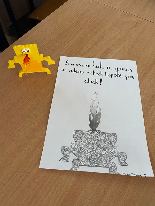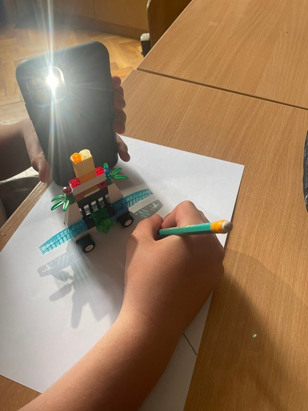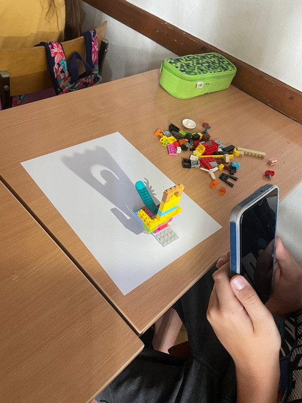 Uczniowie musieli eksperymentować z kształtem i ustawieniem budowli LEGO oraz telefonu, aby osiągnąć jak najlepszy efekt groźnego internetowego potwora. Padający cień należało obrysować ołówkiem, a następnie pokolorować powstały obrazek. Na samym końcu pytaliśmy czat GPT o hasła związane z bezpieczeństwem w sieci, które następnie zapisywaliśmy na plakacie.