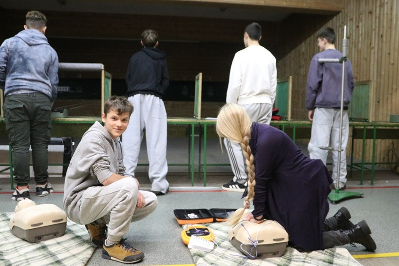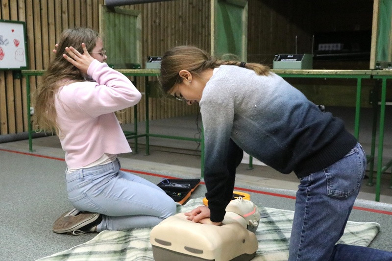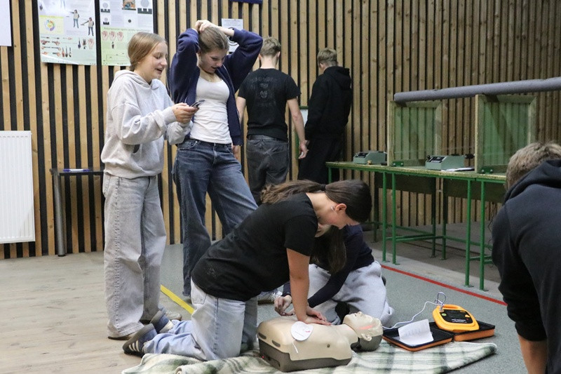 Jednocześnie druga grupa uczniów przypomniała sobie praktyczne postępowanie z poszkodowanym nieprzytomnym – ocenę sytuacji, wezwanie pomocy, pozycję boczną bezpieczną, resuscytację krążeniowo-oddechową (RKO) i obsługę AED.