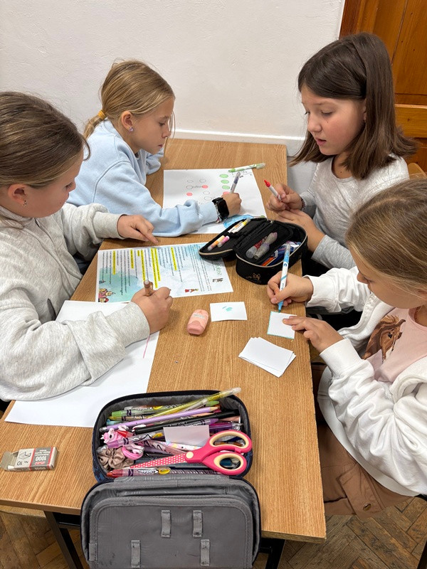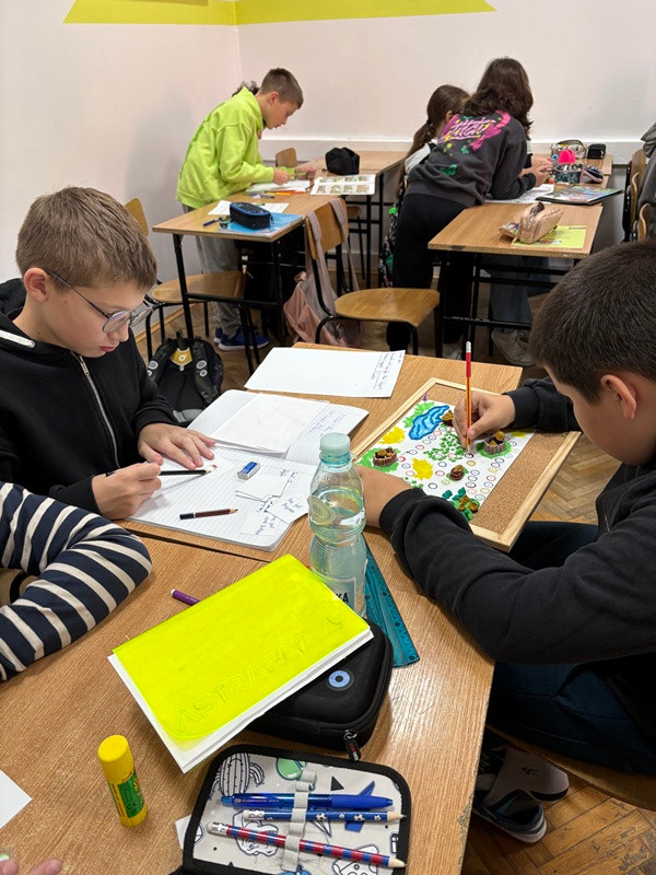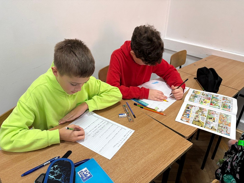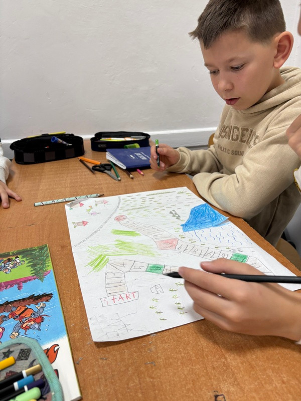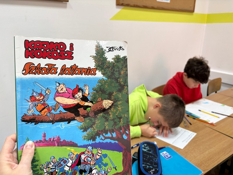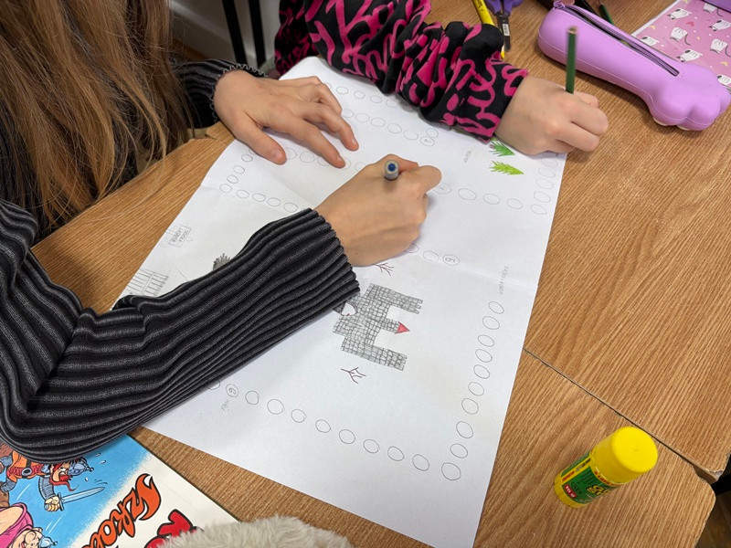 Uczniowie klasy 4B podczas lekcji języka polskiego zamienili się w prawdziwych twórców gier planszowych! Inspiracją do ich pracy była lektura Kajko i Kokosz. Szkoła latania. W parach i małych grupach uczniowie zaprojektowali własne gry, które przeniosły bohaterów komiksu w świat kostek, plansz i kart z zadaniami.