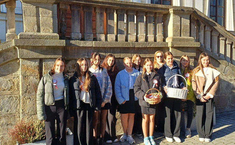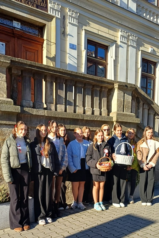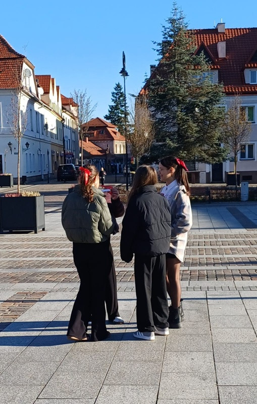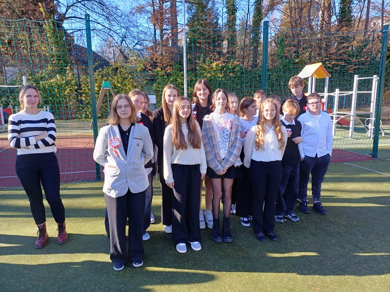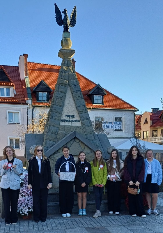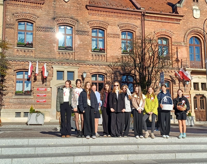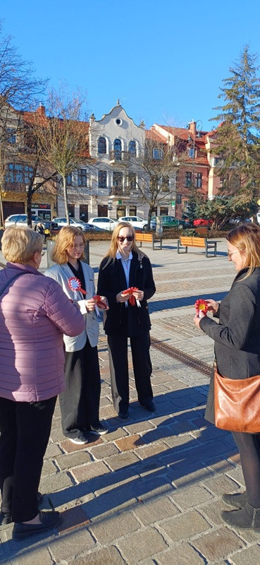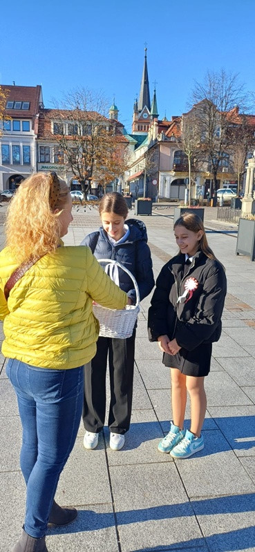 Tego dnia aktywni byli również nasi wolontariusze. Wyruszyli na myślenicki rynek, by w niezwykły sposób uczcić zbliżające się Święto 11 listopada. Uczniowie rozdawali napotkanym mieszkańcom ręcznie wykonane kotyliony, zachęcając jednocześnie do wspólnego świętowania oraz okazywania patriotyzmu. Ten prosty gest sprawił, że zwykłe przejście przez rynek zamieniało się w małe spotkanie z pamięcią i życzliwością.