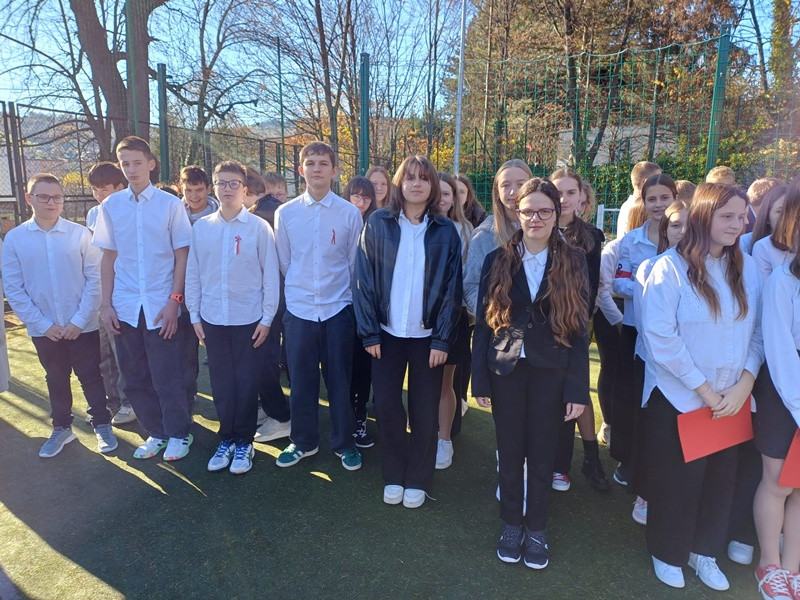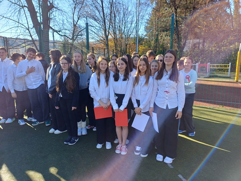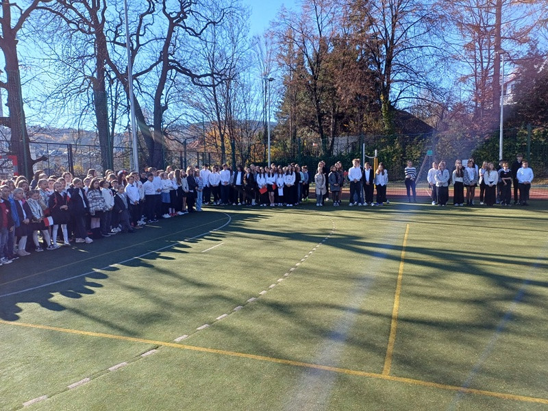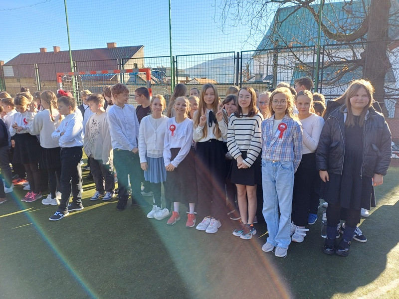 Wspólnym momentem dla całej społeczności szkolnej stała się chwila, gdy zegary wskazały symboliczną godzinę 11:11. Wszyscy uczniowie oraz nauczyciele zebrani na szkolnym boisku odśpiewali hymn narodowy. W ten sposób staliśmy się także częścią ogólnopolskiej akcji „Szkoła do Hymnu”, łącząc nasze głosy z głosami tysięcy uczniów z całego kraju.