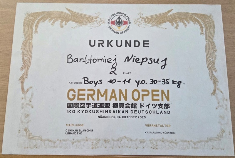 4 października 2025 roku Bartłomiej Niepsuj, uczeń klasy 4B naszej szkoły oraz zawodnik Myślenickiej Akademii Karate Byakko, wziął udział w prestiżowym turnieju IKO German Open, który odbył się w Norymberdze.