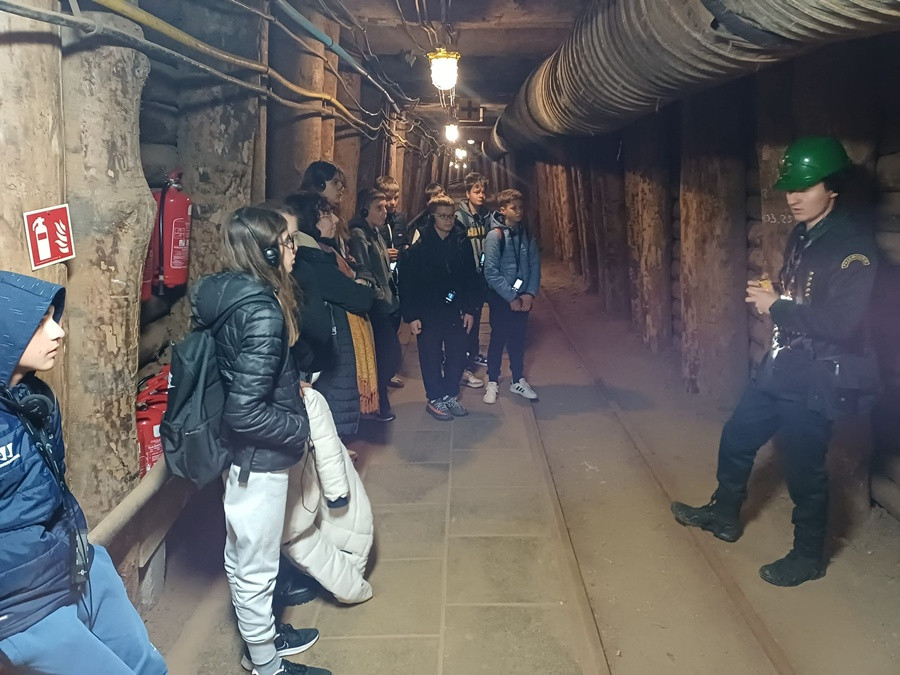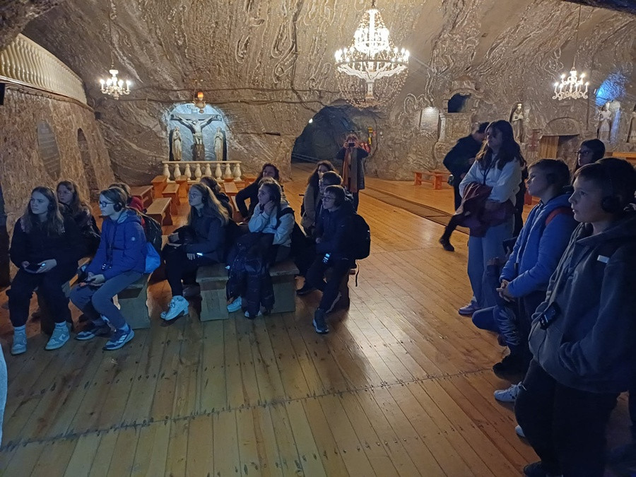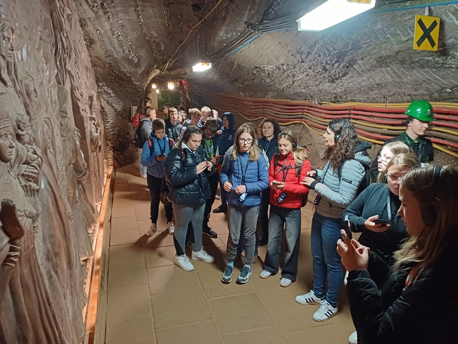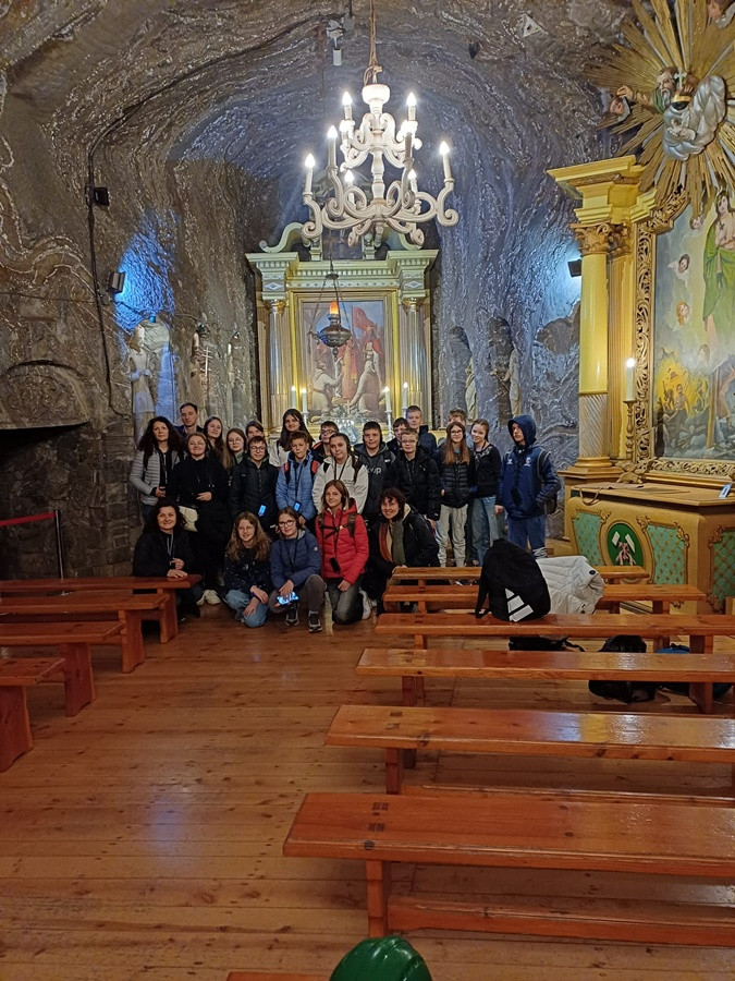 Drugi dzień pobytu uczniów i nauczycieli ze Słowenii w Myślenicach rozpoczął się od wizyty w najstarszej w Polsce Kopalni Soli w Bochni. Zwiedzanie rozpoczęliśmy od zjazdu windą górniczą na głębokość 212 metrów.