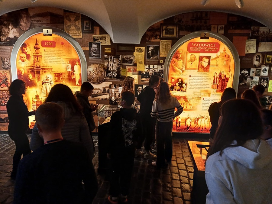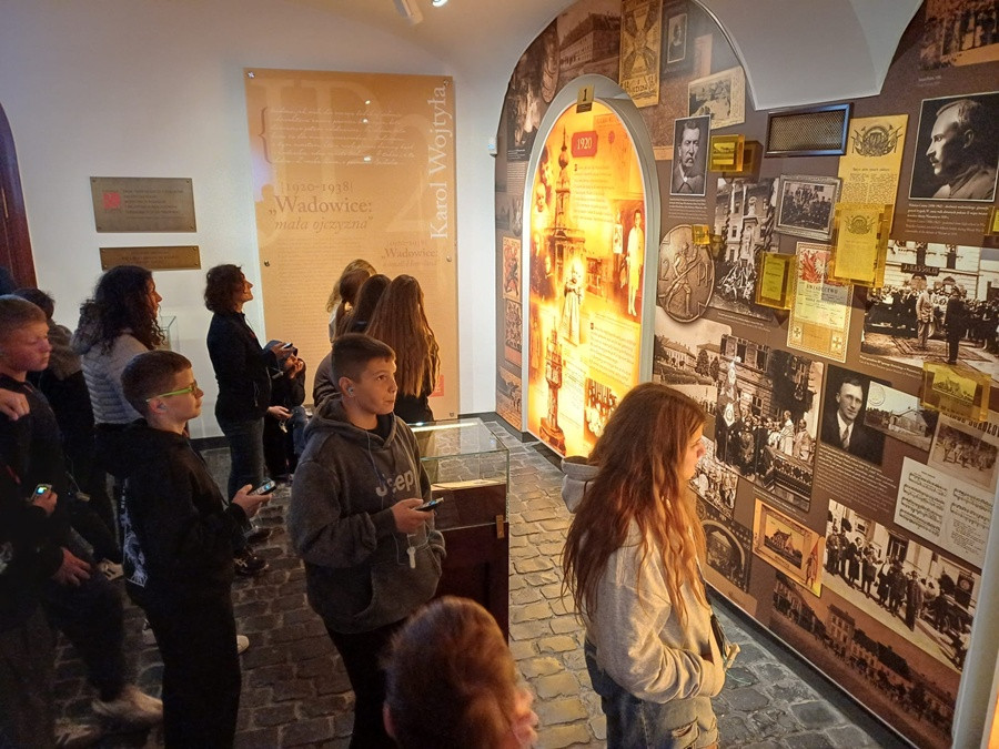 Drugim przystankiem w dzisiejszym planie pobytu były Wadowice. Odwiedziliśmy nowoczesne, multimedialne muzeum - Dom Ojca Świętego Jana Pawła II. Miłą niespodzianką dla uczniów i nauczycieli była możliwość wysłuchania prelekcji muzealnej w ich języku ojczystym. Po całodniowym zwiedzaniu wróciliśmy do Myślenic. W szkole czekał na nas przygotowany poczęstunek oraz gry i zabawy z animatorami.