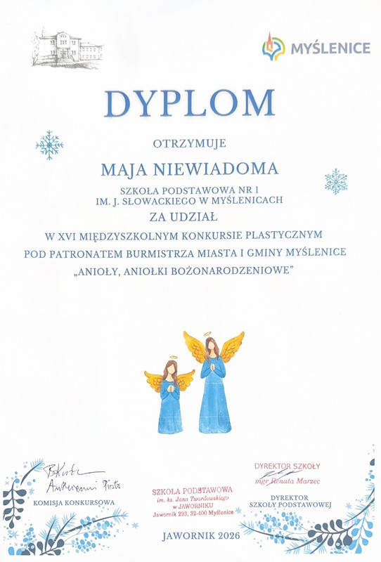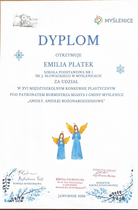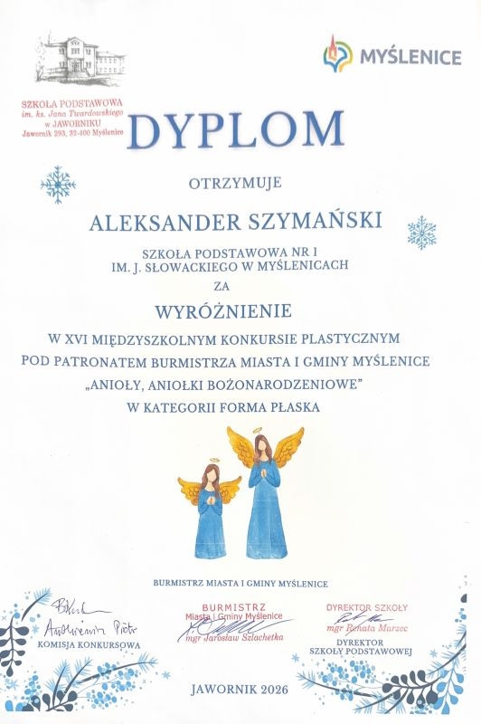 Z radością informujemy, że uczeń klasy 2b Aleksander Szymański zdobył wyróżnienie w XVI edycji Międzyszkolnego Konkursu Plastycznego „Anioły, Aniołki Bożonarodzeniowe”, organizowanego pod patronatem Burmistrza Miasta i Gminy Myślenice, w kategorii forma płaska.