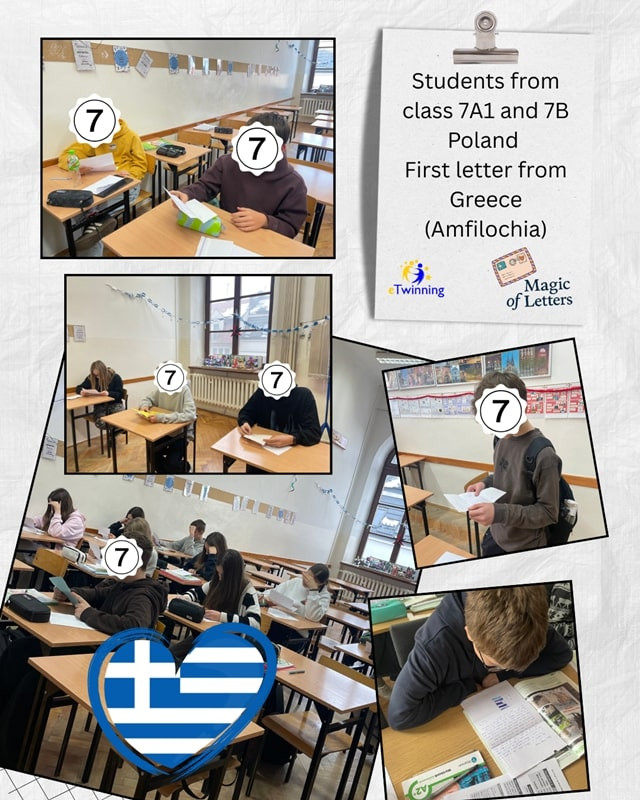 Uczniowie klas 7A (grupa 1) i 7B otrzymali także swoje pierwsze listy ze szkoły 1st High School of Amfilochia. Podobnie jak korespondencja włoska, również listy greckie miały formę pierwszego kontaktu: uczniowie pisali o sobie, podawali podstawowe informacje i dzielili się krótkimi pozdrowieniami.
