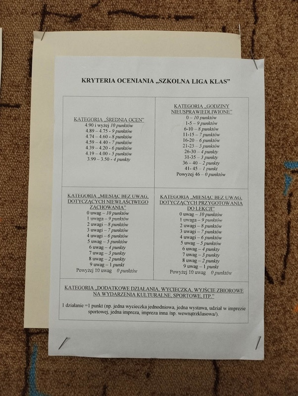 Pragnę Wam przypomnieć, że w ostatnich tygodniach została zaktualizowana Wielka Liga Klas. Znajduje się ona na tablicy przy pomieszczeniu Pani woźnej. Zostały wpisane punkty za średnią klas, nieobecności nieusprawiedliwione oraz uwagi.