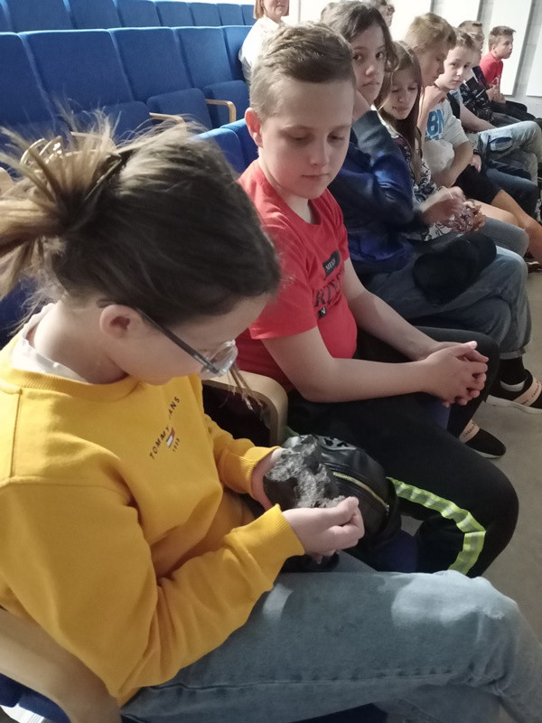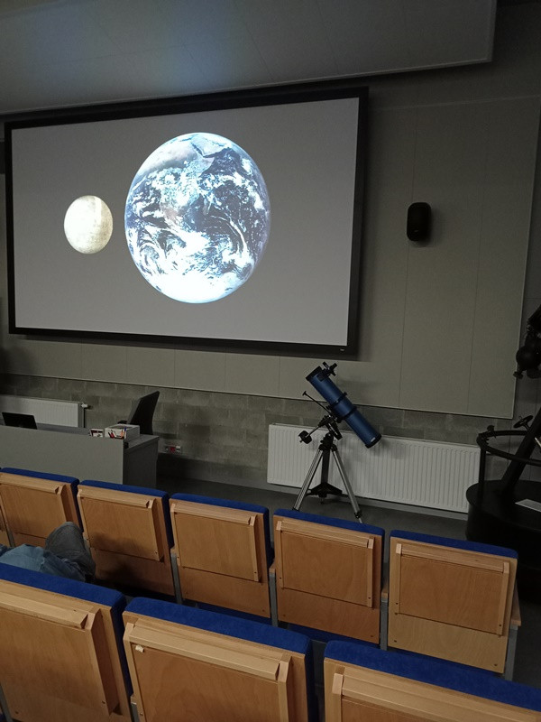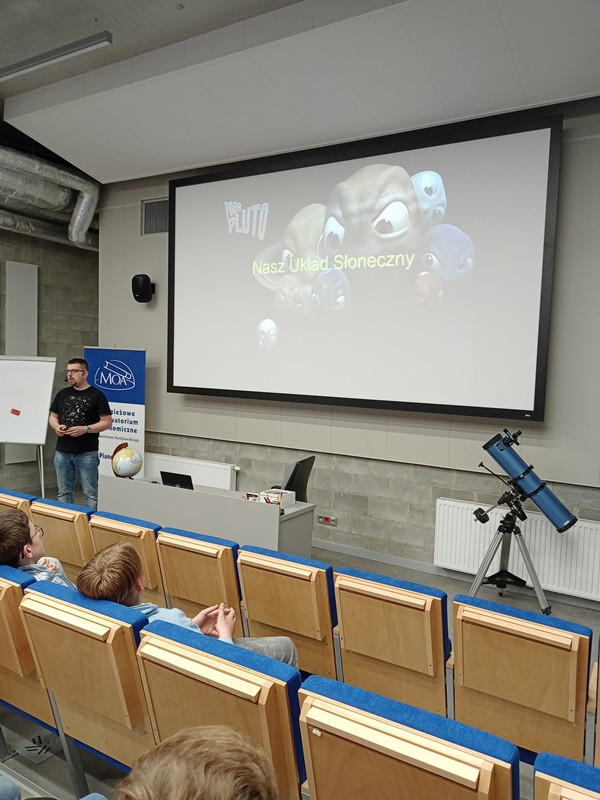 Pierwszym tematem, o jakim nam opowiedział były plamy oraz wybuchy na słońcu. Pokazywał nam filmiki, na których były przedstawione te zjawiska. Następnie mieliśmy lekcję przypominającą, jakie planety wchodzą w skład Układu Słonecznego. Wykładowca opowiadał nam na przykład ile księżyców mają wybrane planety, czy mają pierścienie itp. Przytaczał także różne ciekawostki dotyczące planet. Porównywał pod względem wielkości planety, księżyce i czarne dziury. Po zakończeniu tych prezentacji wyszliśmy na krótką przerwę.