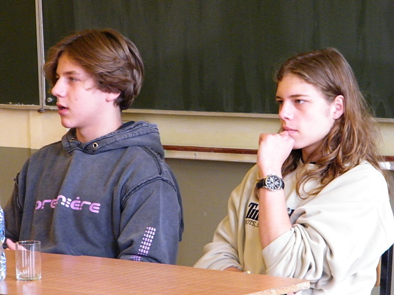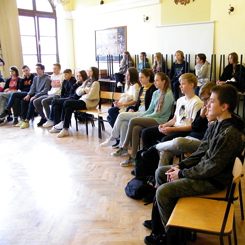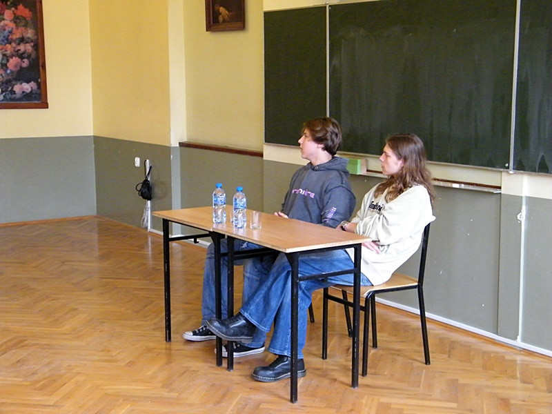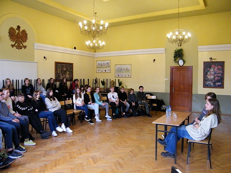 Na te jakże istotne tematy mieliśmy szansę porozmawiać po projekcji nie tylko z naszymi nauczycielami, lecz przede wszystkim z samymi aktorami! Nasze zaproszenie do szkoły przyjęli bowiem Wit i Roch Czerneccy, mieszkańcy Myślenic, niegdyś uczniowie, którzy przemierzali te same szkolne korytarze, co my. Wit jest odtwórcą roli jednego z głównych bohaterów w filmie, Tadka Jasiukiewicza, młodego polskiego harcerza, którego pierwowzorem była autentyczna postać - Tadeusz Jasiński 13-letni obrońca Grodna, użyty przez sowietów jako żywa tarcza. Roch natomiast zagrał w kilku epizodach w filmie.