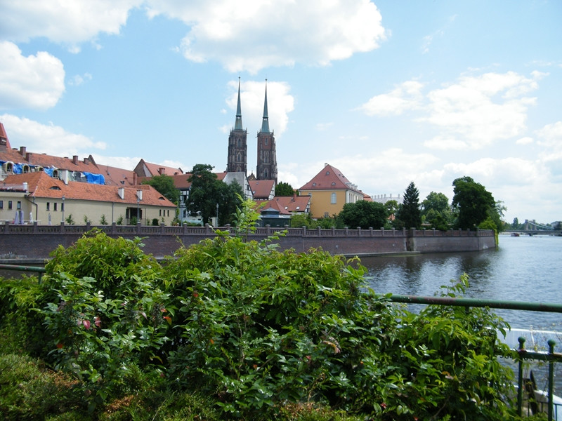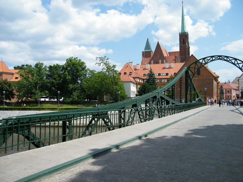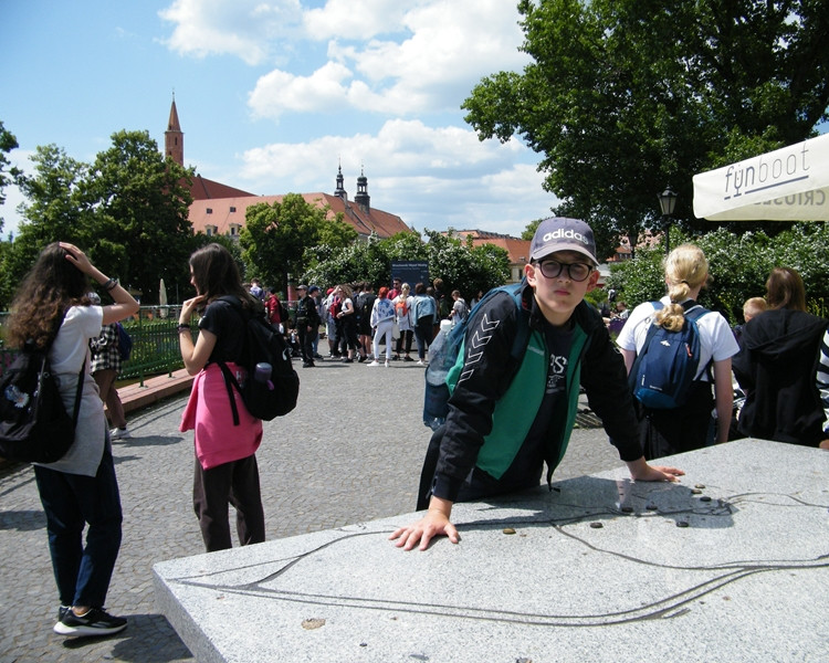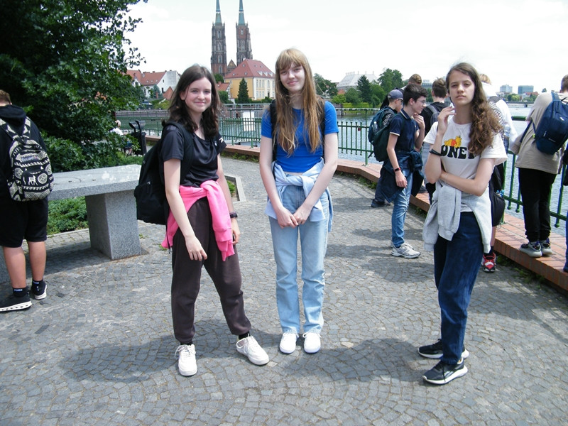 Podróż minęła nam bardzo szybko i zanim się obejrzeliśmy byliśmy w MIEŚCIE SPOTKAŃ czyli we Wrocławiu. Zatrzymaliśmy się na Ostrowie Tumskim i razem z Panią Przewodnik ruszyliśmy zwiedzać pięć katedr, które tam się znajdują oraz zobaczyliśmy Bramę Kluszczaną. Następnie przeszliśmy przez Most Zakochanych i dowiedzieliśmy się o jego historii. Znaleźliśmy się na Ostrowie Piaskowym, gdzie poznaliśmy system rzek przepływających przez Wrocław.