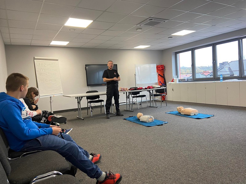 Uczniowie mogli odsłuchać nagrania autentycznych zgłoszeń alarmowych, przebrać się w stroje strażackie oraz wejść do prawdziwego wozu strażackiego. Na koniec nasz przewodnik pan Roman Ajchler przeprowadził szkolenie z pierwszej pomocy i rozdał pamiątkowe odblaski.