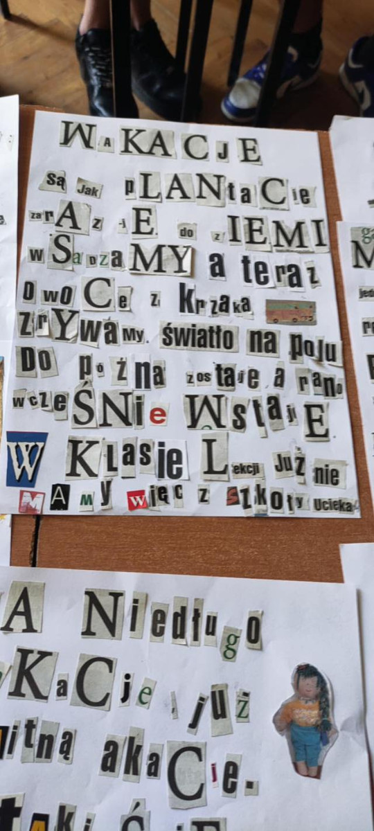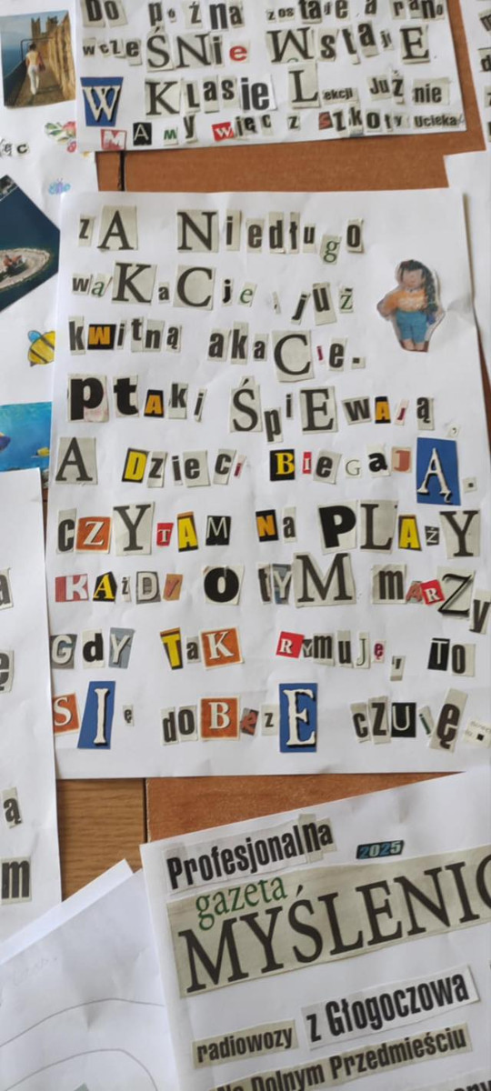 Ostatnie dni roku szkolnego to czas pełen emocji, oczekiwań i twórczej ekspresji. Choć wakacje zbliżają się wielkimi krokami, to kreatywność uczniów wciąż pozostaje na wysokim poziomie. Postanowiliśmy wykorzystać ten moment, angażując młodzież w literacką zabawę, dzięki której mogli wyrazić swoje myśli, marzenia i nadzieje związane z nadchodzącym latem.Jedni piszą rymowanki, pełne humoru i letniego nastroju, inni tworzą reklamy wymarzonych wakacyjnych rekreacji, wiersze, mini-opowieści, felietony oraz kreatywne teksty reklamowe - wszystko to układa się w barwną mozaikę uczniowskiej twórczości, która odzwierciedla ich osobowości oraz entuzjazm wobec zbliżających się wakacji.