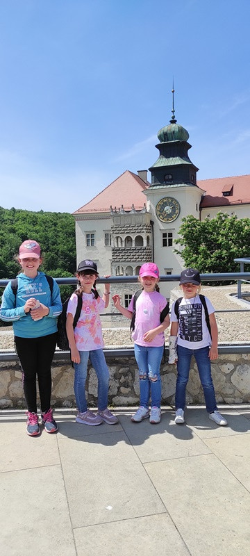 Kolejnym celem naszej wycieczki był Zamek w Pieskowej Skale zwanym ,,orlim gniazdem", gdzie spacerowaliśmy po dziedzińcu i krużgankach, poznając historię tego miejsca. Następnie podeszliśmy pod Maczugę Herkulesa - wapienną skałę mierzącą 25 m. wysokości, gdzie zrobiliśmy pamiątkowe zdjęcie.
